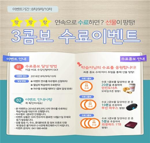 7월 1일부터 10월 12일까지 진행되는 평생능력개발 8차, 9차, 10차 연수에 모두 신청해서 차수별 1개 이러닝 콘텐츠 과정을 수료(3콤보)한 교육생 중 추첨을 통해 5명에게 1TB 외장 하드를 제공한다.