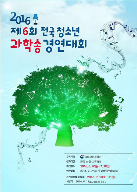 예선 참가희망자는 오는 20일부터 7월 20일까지 경연대회 홈페이지(www.sciencesong2016.com)를 통해 참가신청서, 공연동영상, 단체사진 등을 제출하면 된다. 예선심사는 7월 21일부터 8일간 실시하며 부문별 8팀과 예비후보팀 2팀을 선발해 7월 29일 개별통보와 함께 과학송경연대회 홈페이지를 통해 발표한다.
