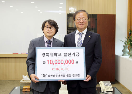 경북대학교 권오걸 경북대 법학전문대학원 원장이 22일 손동철 경북대 총장직무대리를 방문해 제자들을 위해 써달라며 발전기금 1000만 원을 전달했다.
