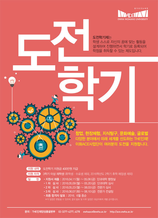 이화여대 '학부교육 선도대학 육성사업(ACE)'의 대표 사업인 '도전학기제'는 재학생들이 휴학하지 않고 자신의 꿈에 맞는 활동을 스스로 설계해 진행함과 동시에 한 학기 학점을 취득할 수 있도록 지원하는 제도다.