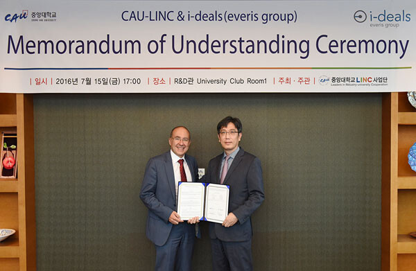 중앙대학교(총장 김창수)는 지난 15일 스페인의 기술거래 및 투자 전문 회사인 everis 그룹의 i-deals사(이하 i-deals)와 글로벌 산학협력 활성화를 위한 업무협약을 체결했다.