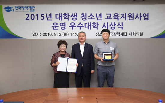 동아대는 안정된 운영으로 전국 162개 사업운영 대학 중 10개 우수대학에 포함됐다. 이에 따라 지난 2일 한국장학재단 서울사무소에서 열린 '2015년 대학생 청소년 교육지원사업 시상식'에서 포상금 100만 원과 이사장 명의의 표창장을 받았다.