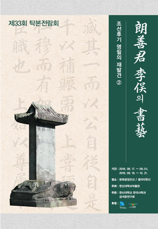 [대학저널 신효송 기자] 한신대학교(총장서리 강성영) 박물관이 오는 17일부터 9월 3일까지 문화공장오산에서 제33회 탁본전람회 '조선후기 명필의 재발견②-낭선군 이우의 서예'를 개최한다.