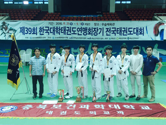 [대학저널 유제민 기자] 충북보건과학대학교(총장 박용석) 태권도외교과 선수들은 지난 8월 25일부터 9월 1일까지 전남 해남 우슬체육관에서 열린 '제39회 한국대학태권도연맹회장기 전국태권도대회'에 출전, 금 1, 은 2, 동 3개를 획득해 남자 대학부 전문대 조별 종합우승을 차지했다.