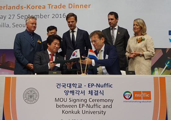 [대학저널 이원지 기자]건국대학교(총장 민상기)와 네덜란드교육진흥원(EP-Nuffic, 원장 양정윤)은 지난 27일, 네덜란드 마르크 뤼터(Mark Rutte) 총리 초청 한-네덜란드 경제협력 간담회에서 한국과 네덜란드대학 간 연구 협업 및 학생들의 취·창업 지원 교육 교류협력을 위한 '리빙랩(Living Labs)' 프로젝트 업무협약을 체결했다.