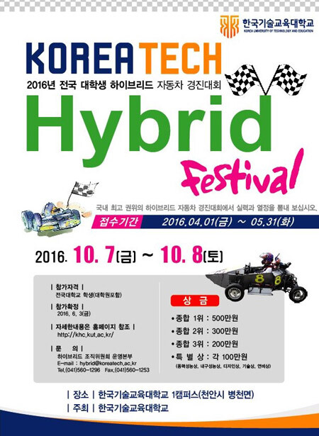 [대학저널 유제민 기자] 코리아텍(한국기술교육대학교. 총장 김기영)은 오는 7일부터 8일까지 코리아텍 캠퍼스에서 '2016년 전국 대학생 하이브리드 자동차 경진대회'를 개최한다.