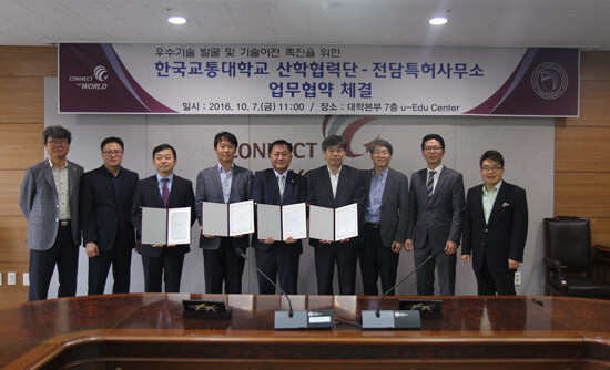 [대학저널 유제민 기자] 한국교통대학교(총장 김영호) 산학협력단은 7일 한국교통대 대학본부 7층 u-Edu Center에서 '한국교통대 산학협력단과 전담 특허사무소 간 업무협약'을 체결했다.
