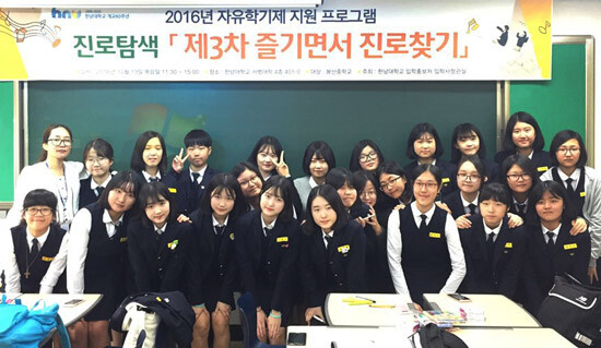 한편 한남대는 지난 7월에 우송중학교 학생 200여 명을, 9월에는 청란여자중학교 학생 110여 명을 학교로 초대해 '즐기면서 진로찾기' 프로그램 제1, 2차를 진행한 바 있다.