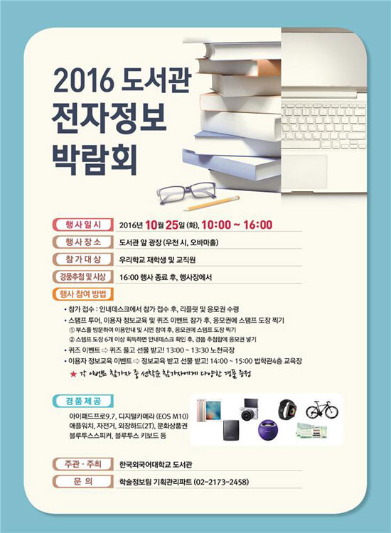 [대학저널 이원지 기자]한국외국어대학교(총장 김인철)는 오는 25일, 한국외대 서울캠퍼스(동대문구 이문동) 도서관 앞 광장(우천시: 오바마홀)에서 학생 및 교직원들을 대상으로 ‘2016 도서관 전자정보 박람회’ 행사를 개최한다.