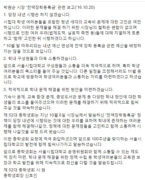 앞서 박원순 시장은 인터넷 방송을 통해 2017학년도부터 등록금을 전액 면제하는 방안을 검토 중이라고 밝혔다. 이에 서울시립대 총학생회는 지난 10일 박원순 시장과의 비공개 면담을 갖고 '학생과의 소통' 등을 요구한 것으로 알려졌다.