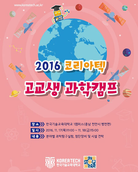 [대학저널 유제민 기자] 코리아텍(한국기술교육대학교. 총장 김기영)은 오는 11월 17일부터 18일까지 개최되는 '2016년 하반기 코리아텍 고교생 과학캠프' 참가 고교생 200명을 모집한다.
