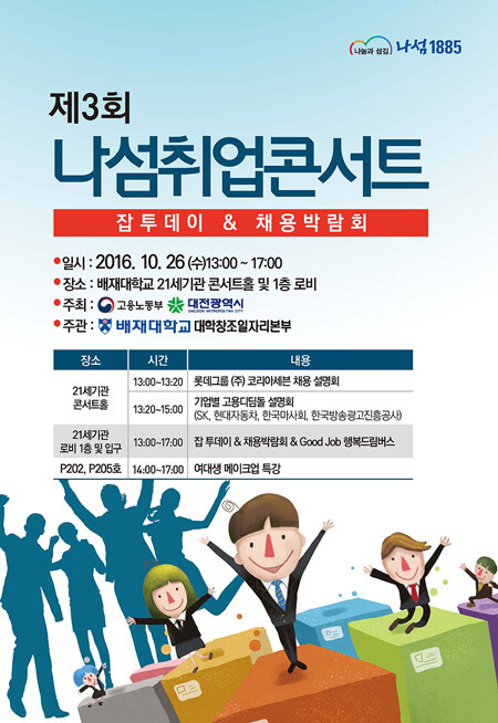 고용노동부, 대전시, 배재대는 공동 주관으로 고용디딤돌 프로그램·나섬취업콘서트를 오는 26일 배재대 21세기관에서 개최한다. 이번 행사는 취업에 실질적인 도움을 주기 위해 총 4개의 구역으로 나눠 각기 다른 주제로 진행된다.