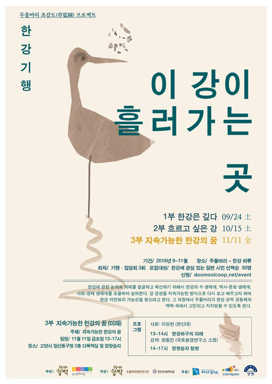 지난 15일에 열린 2부 '흐르고 싶은 강'에서는 서울 도시 계획과 한강의 개발에 대한 흥미로운 역사 강의가 진행됐다. 이번에 열리는 3부는 '지속가능한 한강의 꿈'을 주제로 국토환경연구소 최동진 소장이 '한강 하구의 미래'를 주제로 강의를 펼친다. 이후 고양시 장항습지 일대를 탐방한다.