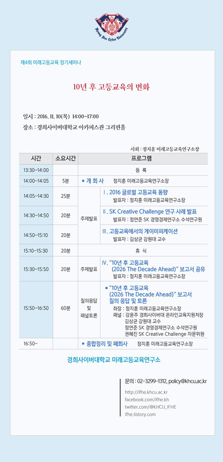 [대학저널 유제민 기자] 경희사이버대학교(총장 조인원) 미래고등교육연구소의 '제4회 미래고등교육 정기 세미나'가 오는 11월 10일 경희사이버대 홍릉캠퍼스 아카피스관 그리핀홀에서 개최된다.