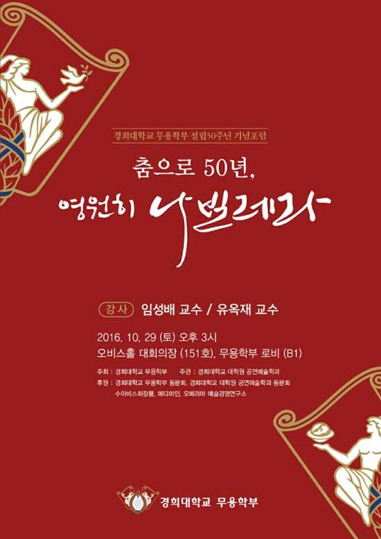 [대학저널 이원지 기자] 경희대학교(총장 조인원) 무용학부는 오는 29일, 경희대 경영대학관 오비스홀에서 무용학부 설립 50주년을 맞아 '춤으로 50년, 영원히 나빌레라' 기념포럼을 개최한다.