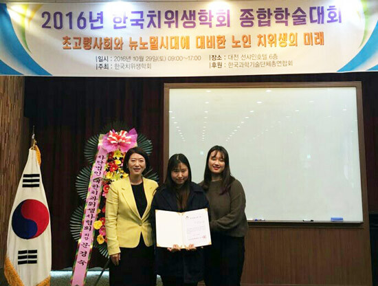 지난 10월 29일 대전 선샤인호텔에서 열린 '한국치위생학회 종합학술대회'에서 U1대 치위생학과 4학년 권지은 씨외 4명의 학생들이 '포괄치위생과정 전후의 구강위생상태 변화'라는 주제로 우수논문상을 수상했다.