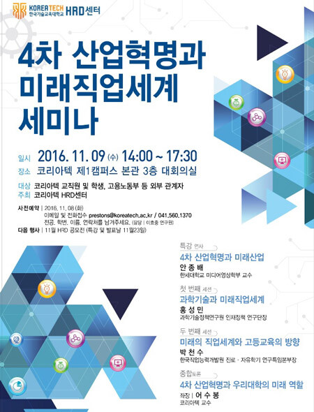 [대학저널 유제민 기자] 코리아텍(한국기술교육대학교. 총장 김기영) HRD센터는 오는 9일 코리아텍 본관 3층 대회의실에서 코리아텍 교직원, 학생, 고용부 관계자, 외부 관계자 등이 참석한 가운데 '4차 산업혁명과 미래직업세계'를 주제로 세미나를 개최한다.