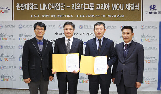 원광대에서 지난 16일 열린 업무 협약식은 조인배 (주)랴오디코리아 대표이사와 송문규 원광대 LINC사업단장을 비롯한 양 기관 관계자가 참석한 가운데 열렸다. 이번 협약은 랴오디 그룹의 당진 투자와 관련해서 이를 통합한 현장실습과 글로벌 산학교육을 통한 인력양성·산학협력을 목적으로 이뤄진 것이다.