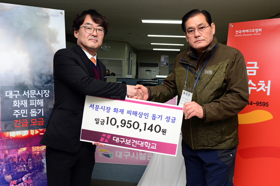 [대학저널 신효송 기자] 대구보건대학교(총장 남성희)가 19일 서문시장 재난안전대책본부를 찾아 교직원들이 뜻을 모은 피해 상인 돕기 성금 1095만 140원을 (사)서문시장4지구 비상대책위원회(위원장 노기호)에 전달했다.