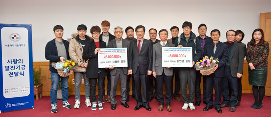 이에 서울과기대는 지난 7일 총장실에서 김종호 총장을 비롯해 권오열 기획처장, 차경철 학생처장, 조봉래 사무국장 및 SeoulTech인재원 장학생이 참석한 가운데 'SeoulTech인재원 발전기금 기부식'을 개최했다.