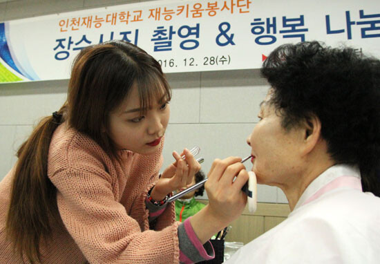 이날 50여 명의 학생들은 관내 독거어르신들을 위한 장수사진 메이크업과 장수사진 촬영, 액자제작 등을 총 120여 명의 주민들에게 무료로 제공했다. 또 이들에게 정성이 담긴 반찬 도시락을 전달하기도 해 따뜻한 사랑 나누기를 몸소 체험할 수 있었다.