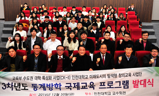 인천대 '미래도시의 탐색형 창의교육 사업단(단장 신은철·이하 미래도시사업단)'은 30일 인천대 송도캠퍼스 교수회관 대회의실에서 '3차년도 동계방학 국제교육 프로그램 발대식'을 개최했다. 발대식은 신은철 단장의 개회사로 시작, ▲박창화 도시과학대학장의 격려사와 조동성 총장의 축사 ▲국제교육 프로그램과 사업단 주요 프로그램 소개 ▲대표 학생 선서 ▲단체사진 촬영 순으로 진행됐다.