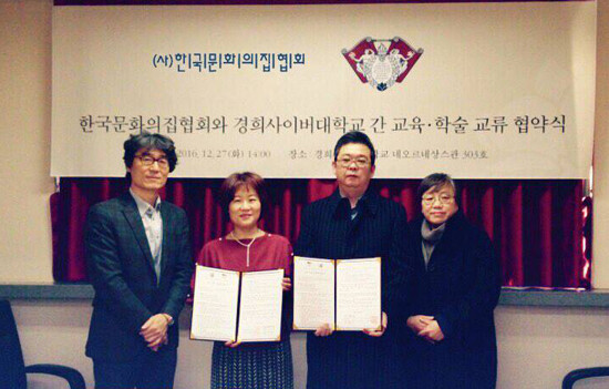 [대학저널 유제민 기자] 경희사이버대학교(총장 조인원)와 사단법인 한국문화의집협회는 창조적인 문화·예술 프로그램의 공동추진과 교육·연구 분야의 교류를 통한 지역사회의 문화·예술 발전에 공헌하기 위해 지난 12월 27일 경희사이버대 네오르네상스관에서 협약식을 진행했다.