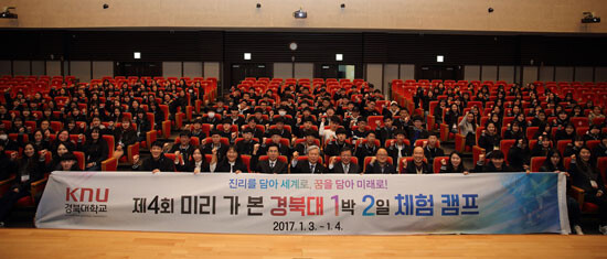 김상동 경북대 총장은 "경북대에서 보낸 1박 2일로 2017년의 첫 시작이 뜨겁게 기억되기를 바란다"며 "이 시간이 막연한 꿈을 구체적이고 이루고자 하는 목표로 전환하는 계기가 되기를 바란다"고 말했다.