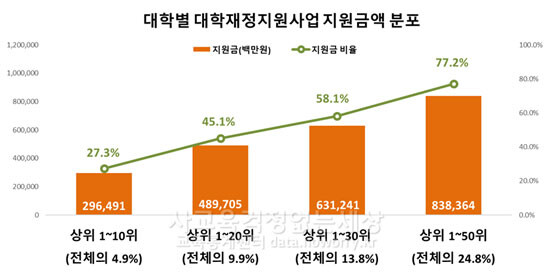 선별적으로 지원하는 현행 대학재정지원사업 구조를 바꿔야 한다는 주장도 제기됐다. 지난 1월 4일 시민단체 사교육걱정없는세상과 더불어민주당 김병욱 의원실이 공동 분석한 바에 따르면 상위 5%의 대학이 대학재정지원사업비의 약 30%를, 상위 10% 대학이 약 50%를 독식하는 것으로 나타났다. 평가를 통한 선별적 지원방식이 대학재정지원의 양극화와 불평등을 유발한다는 것이다.
