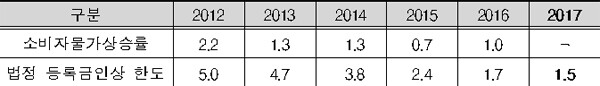 교육부는 지난 2016년 12월 2017학년도 대학 등록금을 2016학년도 대비 1.5%를 초과할 수 없다고 발표했다. 이는 역대 최저 수치에 해당된다. 현행 고등교육법 상 대학 등록금 인상한도는 직전 3개 연도 평균 소비자 물가상승률의 1.5배를 초과할 수 없다.