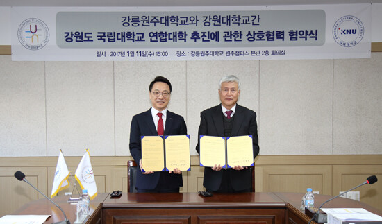 [대학저널 이원지 기자] 강릉원주대학교(총장 반선섭)와 강원대학교(총장 김헌영)는 '강원도 국립대학교 연합대학 추진에 관한 상호협력 협약'을 체결하고 전국에서 가장 선도적인 연합대학 모델을 구축하기로 했다. 협약식은 11일 오후 3시 강릉원주대 원주캠퍼스 본관 2층 회의실에서 열렸다.