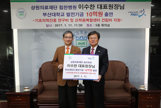 [대학저널 신효송 기자] 부산대학교(총장 전호환)가 부산대 의대 출신 상원의료재단 힘찬병원 이수찬 대표원장으로부터 지난 11일 부산대 본관 5층 총장실에서 10억 원의 발전기금을 전달받았다.