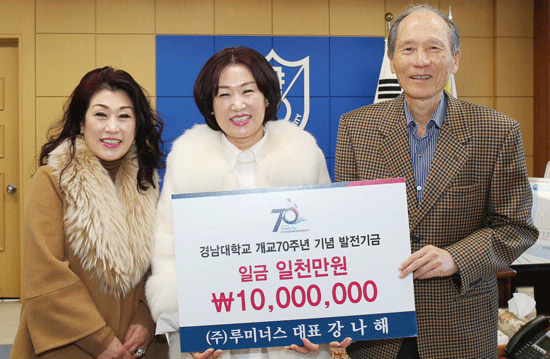[대학저널 정성민 기자] ㈜루미너스 강나해 대표이사가 경남대학교(총장 박재규)에 개교 70주년 기념 발전기금을 기부했다.
