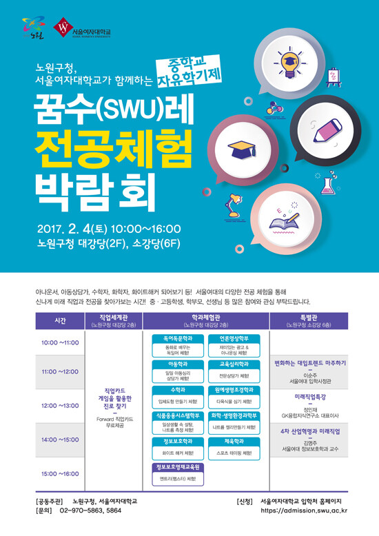 서울여대 입학사정단은 노원구 교육지원과와 공동으로 오는 2월 4일 오전 10시, 서울시 노원구청 대강당 등에서 <중학교 자유학기제 지원 꿈수(SWU)레 전공체험> 박람회를 개최한다. 고교교육 정상화 기여대학 지원사업의 일환으로 시행되는 이번 박람회에서는 직업세계관, 학과체험관, 특별관 등의 부스가 설치돼 초·중학생 눈높이에 맞춘 진로진학정보가 제공될 예정이다.