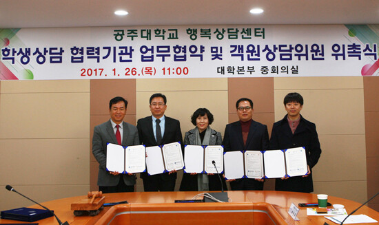 공주대는 지난 1월 26일 공주대 대학본부 회의실에서 공주경찰서 여성청소년과·청문감사관실, 공주시정신건강증진센터, 공주시청소년상담복지센터와 협약을 맺었다. 이로써 공주대는 총 11기관과의 협력으로 재학생들의 위기상황 등에 즉각 상담이 가능하게 됐다.