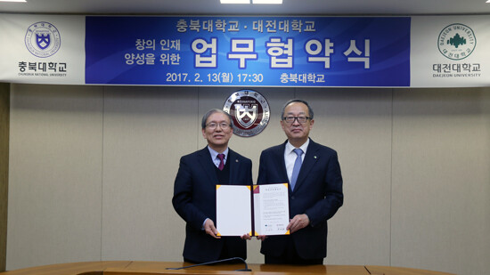 [대학저널 유제민 기자] 충북대학교(총장 윤여표)가 13일 충북대 대학본부 5층 접견실에서 대전대학교(총장 임용철)와 업무 협약을 체결했다.