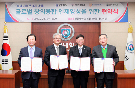 [대학저널 유제민 기자] 선문대학교(총장 황선조), 상명대학교(총장 구기헌), 코리아텍(한국기술교육대학교. 총장 김기영), 한서대학교(총장 함기선)가 22일 선문대 본관 대회의실에서 '글로벌 창의융합 인재양성'을 위한 협약을 체결했다.