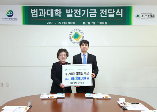[대학저널 신효송 기자] 대구대학교(총장 홍덕률) 법과대학 교수들이 27일 대구대 경산캠퍼스 성산홀 2층 소회의실에서 열린 발전기금 전달식에서 1000만원을 전달했다.