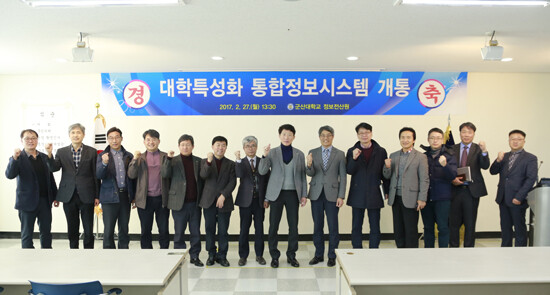 [대학저널 유제민 기자] 군산대학교(총장 나의균)는 27일 군산대 디지털 정보관 2층 세미나실에서 대학특성화 통합정보시스템 개통식을 개최하고 새로운 학사 시스템을 개통했다. 이날 선포식에는 나의균 군산대 총장을 비롯한 주요 보직자 및 관계자 등이 참석했다.