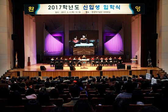 [대학저널 이원지 기자]숭실대학교(총장 황준성) 2017학년도 신입생 입학식이 2일 오전 10시 반 교내 한경직기념관 대예배실에서 3182명의 신입생과 학부모, 황준성 총장, 각 단과대 학장 등 교내·외 1500여 명이 참석한 가운데 거행됐다.