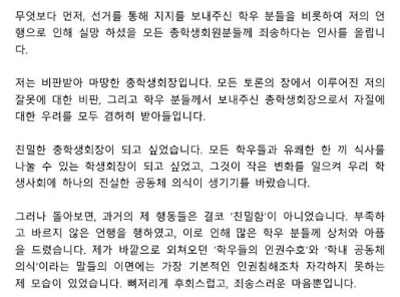 이 씨는 "친밀한 총학생회장이 되고 싶었다. 모든 학우들과 유쾌한 한 끼 식사를 나눌 수 있는 학생회장이 되고 싶었고 그것이 작은 변화를 일으켜 우리 학생사회에 하나의 진실한 공동체 의식이 생기기를 바랐다"면서 "그러나 돌아보면 과거 제 행동들은 결코 친밀함이 아니었다. 부족하고 바르지 않은 언행을 했고 이로 인해 많은 학우분들께 상처와 아픔을 드렸다. 뼈저리게 후회스럽고 죄송스러운 마음일 뿐"이라고 토로했다.