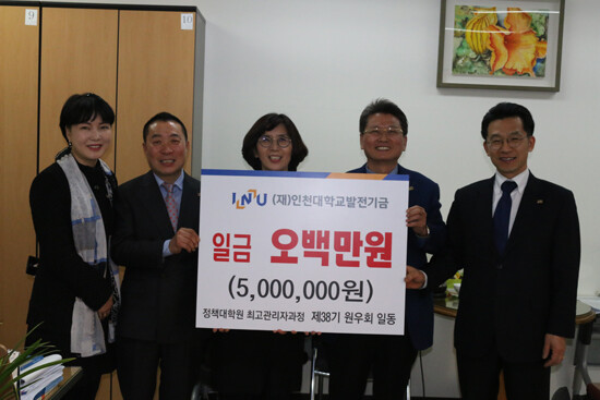 [대학저널 이원지 기자]인천대학교(총장 조동성) 정책대학원 제38기 최고관리자과정 원우회(회장 장수홍)가 지난 7일, 대학발전기금으로 500만 원을 기부했다.