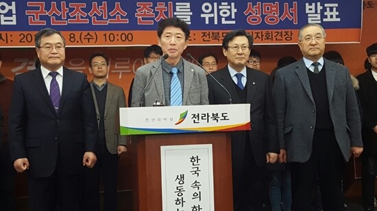 [대학저널 유제민 기자] 전북지역대학교총장협의회는 8일 전라북도청 기자회견장에서 '현대중공업 군산조선소 존치를 위한 성명서'를 발표하고 조선업계 근로자 및 협력업체, 관련 학과 학생들을 위한 특단의 조치를 취해줄 것을 촉구했다.