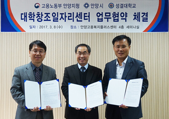 [대학저널 이원지 기자]성결대학교(총장 윤동철)가 지난 8일, 고용노동부 안양지청 안양고용복지플러스센터 세미나실에서 안양시, 고용노동부 안양지청과 ‘대학창조일자리센터 업무협약식’과 ‘2017년 지역·산업 맞춤형 일자리 창출 사업 약정 체결식’을 가졌다.