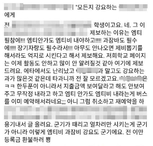 "학과 MT를 가지 않는데도 돈을 필수로 내라고 합니다. 때리고 얼차려 시키는 것만 군기가 아니라 이런 강요도 군기입니다."