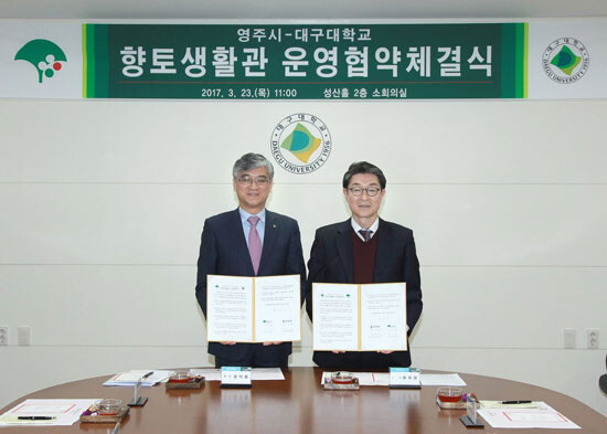[대학저널 신효송 기자] 대구대학교(총장 홍덕률)가 23일 대구대 경산캠퍼스 성산홀(본관) 2층 소회의실에서 영주시(시장 장욱현)와 향토생활관 운영 협약을 체결했다.