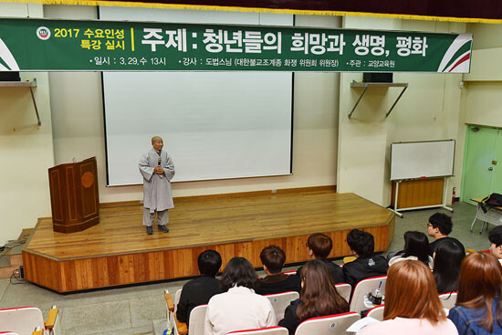 호원대는 학생들의 자아성찰과 인성함양을 위해 매주 수요일 '수요인성특강'을 진행하고 있다. 도법스님은 생명평화사상가로 활동하며 지난 2004년부터 5년간 '생명평화탁발순례'로 3만 리를 걷는 등 생명평화의 가치를 전하고 있다.