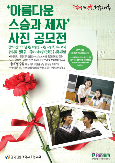 [대학저널 유제민 기자] 오는 5월 15일 스승의 날을 맞아 제자와 스승의 아름다운 사진이 공개된다. 한국전문대학교육협의회(회장 이기우 인천재능대학교 총장. 이하 전문대교협)는 스승의 날을 맞이해 '아름다운 스승과 제자' 사진 공모전을 개최한다.