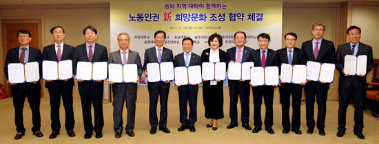 서강석 총장은 18일 광주시청 3층 비즈니스룸에서 윤장현 광주시장과 광주·전남 11개 대학 총장이 함께한 '대학 노동인권 신장' 협약식에 참석했다. 이들은 이날 노동사각 지대에 있는 대학생들의 노동인권을 개선하고 보호증진을 위해 힘을 모으기로 했다.
