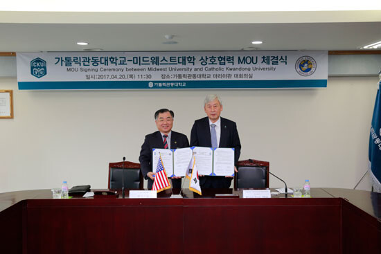 협약식에는 가톨릭관동대 천명훈 총장과 미드웨스트대학(Midwest University)의 설립자인 James Song 총장 등 양 기관 관계자들이 참석했다.